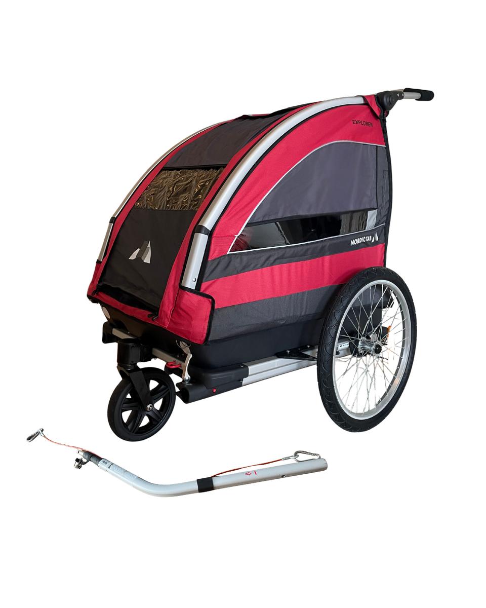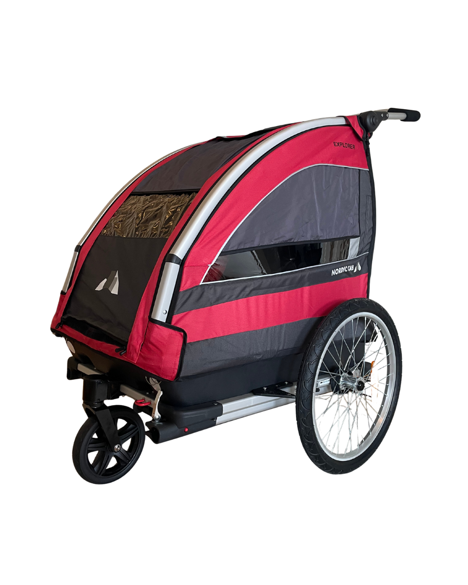 Nordic Cab Explorer pyöräkärryyn mahtuu kaksi lasta vierekkäin, enimmäiskantokyky on 45kg